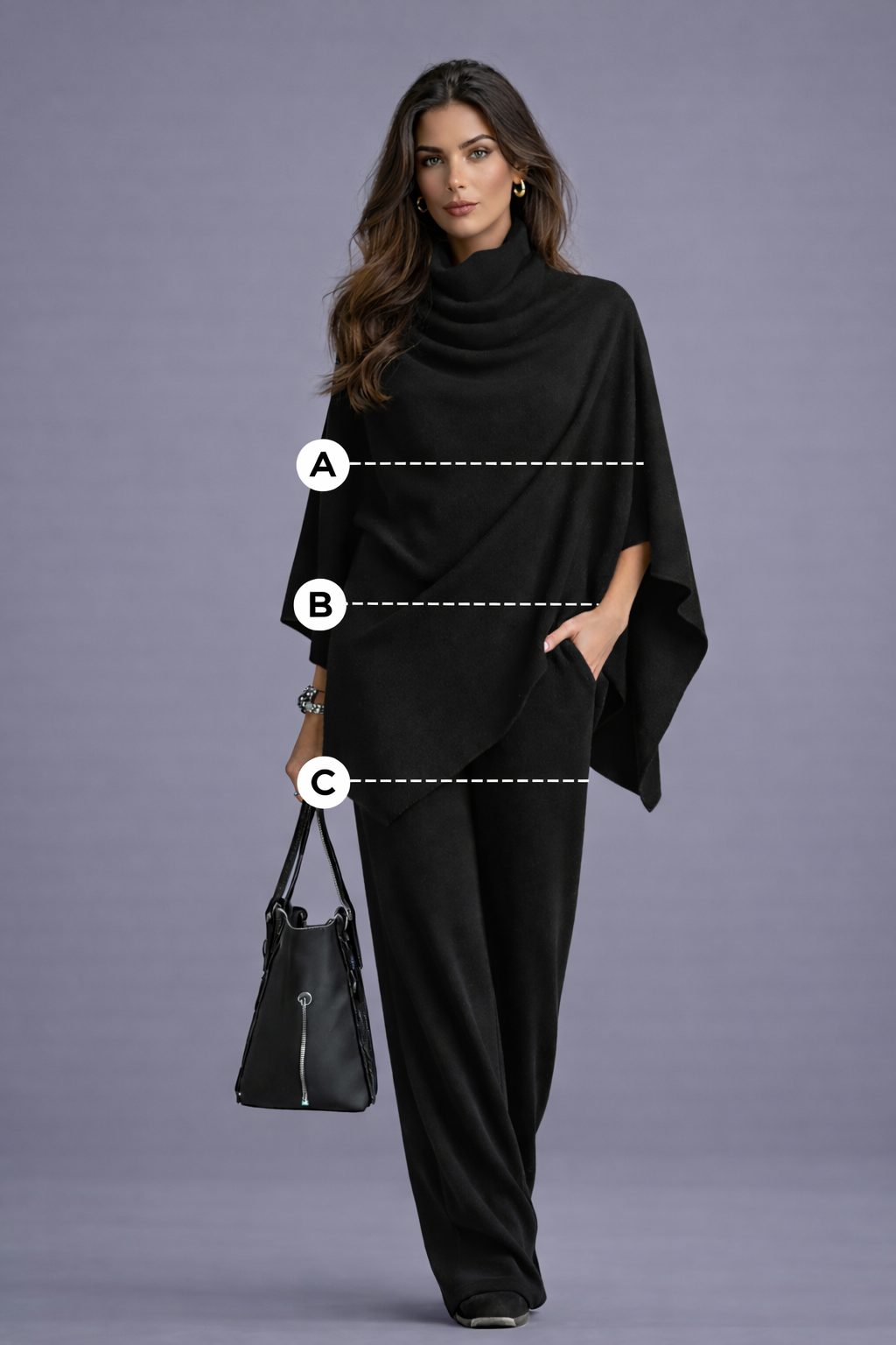La parte superior presenta un diseño fluido con cuello elevado y caída asimétrica, aportando movimiento y un aire refinado. El pantalón de pernera amplia completa el conjunto con una silueta armoniosa y una sensación de ligereza que acompaña el movimiento con naturalidad.